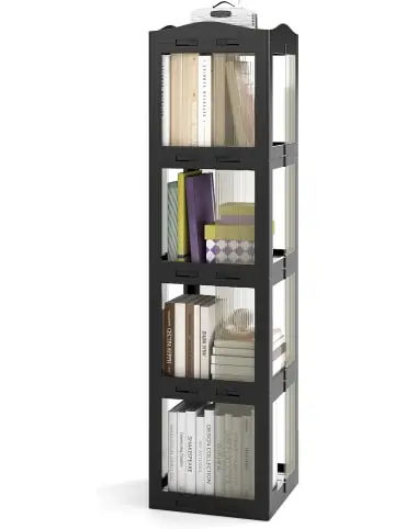 Beschreibung: Dieses drehbare Bücherregal wurde konzipiert, um Platz zu maximieren und gleichzeitig einfachen Zugriff auf Ihre Lieblingsbücher und dekorativen Gegenstände zu bieten. Mit einer 360°-Drehbasis ermöglicht dieses Regal eine sanfte Rotation, sodass Sie Ihre Sammlung mühelos aus jedem Blickwinkel durchstöbern können. Die klappbare Konstruktion verleiht Vielseitigkeit und erleichtert die Aufbewahrung bei Bedarf. Die transparenten Paneele fügen sich unauffällig in Ihren Raum ein. Die eckfreundliche Form hilft dabei, häufig vernachlässigte Ecken optimal zu nutzen, was das Regal zu einer praktischen Wahl für verschiedene Räume macht, in denen effiziente Stauraumlösungen wichtig sind.Eigenschaften: 4-stufiges Eckbücherregal maximiert Stauraum und spart Bodenfläche 360° drehbares Design ermöglicht einfachen Zugriff auf Bücher aus jedem Winkel Drehbasis mit Kugellagern, sanfte Drehung, stabil und sicher, langlebig gebaut Klappbares Design verkürzt die Montagezeit und macht den Aufbau schnell und unkompliziert Sicherheitsverriegelung sichert das Regal fest an seinem Platz Oberes Regal mit erhöhten Kanten schützt vor dem Herunterfallen von Gegenständen Transparente Paneele passend für die meisten Büchergrößen Antirutsch-Fußpolster schützen den Boden vor Kratzern Material: PP, ABS Gesamtmaße: 36,5 x 36 x 141,5 cm (L x B x H) Tragfähigkeit je Regal: 10 kg Nettogewicht: 6,5 kgLieferungsumfang: 1 x Bücherregal 1 x Anleitung