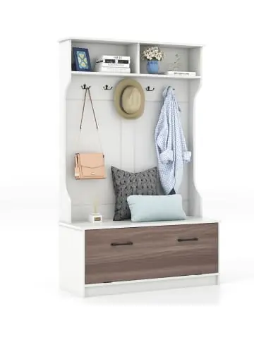 Beschreibung: Diese Garderobe ist eine tolle Aufbewahrungsmöglichkeit für Ihren Eingangsbereich, Flur oder Schlafzimmer. Sie verfügt über großzügigen Stauraum, darunter 5 Doppelhaken, 2 offene Regale und 1 geschlossenen Schrank mit 2 pneumatischen Stangen. Sie können darin Ihre Taschen, Hüte, Kleidung, Schmuck und andere Dinge aufbewahren. In der Zwischenzeit gibt es eine Sitzbank, auf der Sie bequem die Schuhe wechseln können. Die Bank trägt ein Gewicht von bis zu 90 kg. Ihr solider Rahmen und die rutschfesten Fußpolster sorgen für allgemeine Stabilität. Und der zusätzliche Kippschutz sorgt für eine sichere Befestigung an der Wand und sorgt so für mehr Stabilität und Sicherheit. Sie müssen sich keine Sorgen machen, dass es plötzlich zusammenbricht.Eigenschaften: 2 offene Fächer und 1 Türschrank mit 2 Fächern zur Aufbewahrung Doppelzinkenhaken und große Ablagefläche für verschiedene Anwendungen Pneumatische Stangen und Magnetverschlüsse zum einfachen Öffnen oder Schließen Kippschutz für zusätzliche Stabilität und Sicherheit Sicheres und stabiles Design Hochwertiger Holzwerkstoff für den Langzeitgebrauch Ideal für Flur, Schlafzimmer usw. Einfache Montage mit übersichtlicher Bedienungsanleitung und komplettem Zubehör Farbe: Weiß Material: Holzwerkstoff Gesamtmaße: 100 x 40 x 160 cm (L x B x H) Höhe des oberen Fachs: 20 cm Höhe des Türschranks: 43 cm Abstand zwischen oberem Fach und Sitzbank: 95 cm Breite der Basis: 39 cm Tragfähigkeit der Bank: 90 kg Nettogewicht: 32,5 kgLieferungsumfang: 1 x Garderobenständer 1 x Anleitung