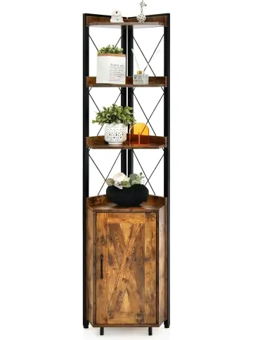 Beschreibung: Unsere Eckschränke helfen Ihnen, den Platz in Ihrem Zimmer zu maximieren! Seine rechtwinkligen Seiten passen genau in die Ecken und sparen wertvolle Bodenfläche. Außerdem verfügt er über reichlich Stauraum: darunter 4 offene Regale und 1 Schrank mit Tür. Seine verstellbaren Regale im Schrank ermöglichen es Ihnen, Gegenstände unterschiedlicher Größe zu platzieren. Darin können Sie ganz einfach Ihre Bilderrahmen, Bücher, Dekorationen oder Topfpflanzen aufbewahren. Unter Berücksichtigung von Stabilitätsproblemen ist der Lagerschrank mit Kippschutz und verstellbaren Füßen ausgestattet. Dieser Eckschrank mit Metallrahmen ist zweifellos sehr langlebig. Lassen Sie sich nicht durch begrenzten Platz einschränken – versuchen Sie, Ihren Stauraum zu erweitern und Ihrem Zimmer mit diesem Eckschrank Stil zu verleihen!Eigenschaften: Die rechtwinklige Kante des Schranks kann nah an der Ecke sein, um Platz für Sie zu sparen Verstellbarer Einlegeboden für unterschiedliche Artikelgrößen, welcher auch separat abgenommen werden kann Erhöhte Kanten der Regale schützen Ihre Artikel vor dem Herunterfallen Die Kippsicherung hilft Ihnen, den Schrank an der Wand zu befestigen Verstellbare Füße ermöglichen das Ausbalancieren des Eckschranks auf unebenen Böden Mit einem Metallrahmen und einer stabilen X-förmigen Struktur ist der Eckschrank sehr robust Stilvoller Industriestil und Scheunentordesign bringen einfach Stil und Charme in Ihr Zuhause Material: Holzwerkstoff, MDF, Metall Gesamtmaße: 48 x 32 x 180cm (L x B x H) Belastbarkeit jedes Regalbodens: 20 kg Nettogewicht: 22 kgLieferungsumfang: 1 x Hochschrank 1 x Anleitung