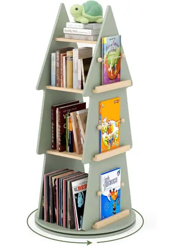 Beschreibung: Verwandeln Sie alltägliche Aufbewahrung in ein spannendes Entdeckungserlebnis mit diesem drehbaren Kinderbücherregal. Mit seiner verspielten Baumform und dem 360° drehbaren Design bietet dieses freistehende Regal eine praktische und ansprechende Möglichkeit, Bücher im Raum junger Leser zu organisieren und zu präsentieren. Es verfügt über 4 Hauptablagen und 6 zusätzliche Seitenregale, die reichlich Platz für Bücher, Spielzeug, Bastelmaterialien und Dekoartikel bieten. Gefertigt aus massivem Kiefernholz und MDF garantiert dieses drehbare Bücherregal Stabilität und Langlebigkeit. Dank kleiner Stellfläche wird der Raum optimal genutzt – ideal für Kinderzimmer, Schlafzimmer, Spielzimmer oder Wohnzimmer.Eigenschaften: 360° drehbar für Rundum-Zugriff und -Präsentation 4 offene Regalböden mit 3 Trennwänden zur einfachen Organisation 6 Seitenregale für zusätzlichen Stauraum Massives Kiefernholz bietet starken Halt Baumform verleiht einen verspielten und charmanten Touch Hochwertiger Drehteller für sanftes Drehen Rutschfeste Füße schützen den Boden vor Kratzern Perfekt für Kinderzimmer, Spielzimmer oder Wohnzimmer Leicht zu reinigende Oberfläche für wenig Pflegeaufwand Montage erforderlich Material: Kiefernholz, MDF Gesamtmaße: 48 x 102 cm (Ø x H) Nettogewicht: 11 kg Tragfähigkeit: 20 kgLieferungsumfang: 1 x drehbares Kinderbücherregal 1 x Anleitung