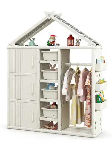 Beschreibung: Suchen Sie nach zusätzlichem Stauraum für Ihre Kinder, um Mäntel, Kleider und Spielzeug zu verstauen? Dieser einfach zu montierende Kinderschrank erfüllt Ihre Bedürfnisse. Er verfügt über eine robuste Stange zum Aufhängen von Kleidung und 4 offene Ebenen mit Boxen, 3 geschlossene Würfel sowie 3 Seitenkörbe zur Aufbewahrung von Spielzeug, Büchern, Schuhen usw. Aus hochwertigem HDPE hergestellt, ist der gesamte Aufbewahrungsschrank stabil und hat eine gute Tragkraft. Außerdem verleihen sein hausähnliches Erscheinungsbild und die leuchtenden Farben dem Kinderzimmer Lieblichkei.Eigenschaften: Aus hochwertigem HDPE-Material, das für Ihre Kinder sicher und sehr langlebig ist 3 Würfel mit Türen zur Platzierung von großen Gegenständen und Schutz vor Staub Offene Ebenen schaffen einen größeren Platz für Spielzeug Mit Aufbewahrungsboxen für Spielzeug oder andere Gegenstände Verstellbare Regalplatten und Seitenkörbe für unterschiedliche Bedürfnisse Niedliche Aufkleber sind enthalten, um den Schrank zu dekorieren Kippschutz bietet zusätzliche Sicherheit für Ihre Kinder Einfache Installation mit detaillierten AnweisungenTechnsiche Daten: Material: HDPE Gesamtabmessungen: 130 x 34 x 156 cm (L x B x H) Nettogewicht: 17,5 kg Gewichtskapazität jedes Würfels: 25 kg Gewichtskapazität der mittleren Schicht: 10 kg Geeignetes Alter: Über 3 Jahre altLieferungsumfang: 1 X Kinderregal 1 X AnleitungAchtung! Nicht geeignet für Kinder unter 3 Jahren.