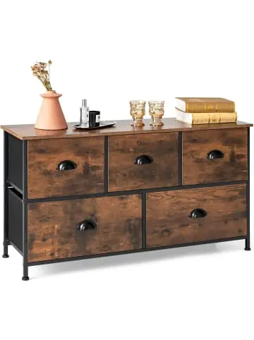 Beschreibung: Unsere Kommode ist ein großartiger Aufbewahrungsorganisator für Ihr Zuhause, der gleichzeitig den Raum schmückt. Auf der Tischplatte können Sie Ornamente, Pflanzen und Sammlungen ausstellen. Und 5 Schubladen in 2 Größen sind in der Lage, Ihre verschiedenen Aufbewahrungsbedürfnisse zu erfüllen, wie Bücher, Kleidung, Spielzeug und mehr. Außerdem sind die Schubladen herausnehmbar und faltbar, je nach Ihren tatsächlichen Bedürfnissen. Die Schubladen sind mit Metallgriffen für sanftes Ziehen und lange Lebensdauer ausgestattet. Mit ihrem einfachen und schlanken Design eignet sich diese breite Kommode für viele Orte, einschließlich Wohnzimmer, Schlafzimmer, Eingangsbereich usw. Die Montage ist mit Anleitung und Zubehör einfach und schnell.Eigenschften: Viel Stauraum mit geräumiger Tischplatte und 5 Schubladen 5 Schubladen sind in 2 Größen für unterschiedliche Aufbewahrungsanforderungen Herausnehmbare und faltbare Schubladen sind praktisch für die Aufbewahrung Metallgriffe helfen beim Öffnen und Schließen der Schubladen Hergestellt aus rostfreiem Eisenrahmen, verschleißfestem Vliesstoff und MDF Verstellbare Fußpolster halten das Gleichgewicht und schützen den Boden vor Kratzern Pflegeleicht mit wasserdichter Tischplatte Ausgestattet mit Anti-Fall-Barrieren, um Schubladen an Ort und Stelle zu halten Material: MDF + Vliesstoff Gesamtmaße: 100 cm x 30 cm x 54 cm (L x B x H) Maße der großen Schublade: 46 cm x 28 cm x 22 cm (L x B x H) Maße der mittleren Schublade: 30 cm x 28 cm x 22 cm (L x B x H) Belastbarkeit der Tischplatte: 30 kg Gewichtskapazität jeder Schublade: 5 kg Nettogewicht: 10 kgLieferungsumfang: 1 x Kommode mit 5 Schubladen 1 x Anleitung