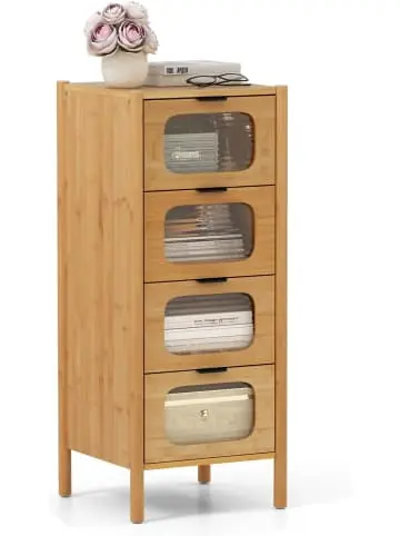 Beschreibung: Platzieren Sie Ihre wichtigsten Dinge in diesem stilvollen Aufbewahrungsschrank aus Bambus! Diese Kommode mit 4 Schubladen und breiter Oberseite bietet einzigartige und vielseitige Aufbewahrungsmöglichkeiten. Der robuste Aufbewahrungsschrank aus Bambus kombiniert Haltbarkeit mit Stil, während die geriffelte Front aus gehärtetem Glas einen Hauch von Raffinesse verleiht. Zugleich verfügt sie mit 4 Schubladen über eine stabile Konstruktion mit erhöhten Stützbeinen und rutschfesten Fußpolstern. Zudem sorgt die Kippsicherung dafür, dass die Kommode sicher aufrecht steht und bietet zusätzliche Sicherheit. Mit ihrem modernen Design aus der Mitte des Jahrhunderts verleiht diese Kommode Ihrem Raum einen schicken Retro-Charme.Eigenschaften: Geräumige Oberseite bietet reichlich Platz für Fotos und Pflanzen 4 große Schubladen halten ihre Sachen ordentlich verstaut Hergestellt aus nachhaltigem und verformungsbeständigem Bambus für lange Lebensdauer Schubladen aus gehärtetem Glas sind robust, transparent und kratzfest Ausgestattet mit Kippschutz für höhere Stabilität und Sicherheit Stabile Stützbeine mit genügend Freiraum für einfache Bodenreinigung Rutschfeste Fußpolster verhindern Kratzer auf dem Boden Schlanker Metallgriff und sanftes Schließen für geräuschlose Nutzung Modernes Design aus der Mitte des Jahrhunderts passt harmonisch zur Inneneinrichtung Durchdachte Details sorgen für ein besseres Benutzererlebnis Montage erforderlich Material: Bambus, gehärtetes Glas, MDF Gesamtmaße: 40 x 40 x 97 cm (L x B x H) Schubladengröße: 30 x 34 x 15,5 cm (L x B x H) Höhe vom Boden: 11,5 cm Nettogewicht: 19 kg Max. Tragkraft: 40 kgLieferungsumfang: 1 x Kommode mit Schubladen 1 x Anleitung