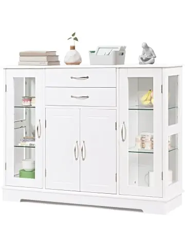 Beschreibung: Dieser graue Aufbewahrungsschrank besteht aus hochwertigen MDF-Platten mit NC-Lackierung, wodurch er langlebig und wasserfest ist. Durch seine Struktur hat er eine hohe Tragfähigkeit. Durch die Einlegeböden und Schubladen wird Ihnen viel Platz für Geschirr, Bücher, etc. Auf der großen Oberfläche lassen sich dekorative Objekte, Fotorahmen oder Topfpflanzen verstauen. Durch die hochwertigen Materialien ist der Schrank sehr robust, zudem sind die Griffe ergonomisch geformt. Dieser Sideboard ist also nicht nur ein dekoratives, sondern auch sehr praktisches Möbelstück.Eigenschaften: Bietet mit drei Fächern und zwei Schubladen viel Platz zur sortierten Aufbewahrung von Gegenständen Aus hochwertigen MDF-Platten, robust und langlebig Tür mit geräuschloser gelenkiger Verbindung Leise und hochwertige Laufschienen der Schubladen Durch ergonomische Griffe bequem zu nutzen Durch NC-Lackierung wasserdicht und leicht zu reinigen Modernes Design, passend zu jeder Küche und jedem Esszimmer Material: MDF-Platten & Hartglas Gesamtmaße: 107 x 30 x 82 cm (L x B x H) Nettogewicht: 33,5 kg Tragfähigkeit der Tischplatte / Glasböden: 9 kg Tragfähigkeit der Schublade: 45 kg Tragfähigkeit des unteren Einlegebodens: 22,5 kgLieferumfang: 1 x Sideboard 2 x Schubladen 1 x Französische Tür 2 x Einzeltüren 4 x Glas-Einlegeböden 1 x MDF-Einlegeboden 1 x Anleitung