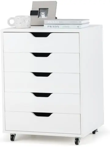 Beschreibung: Dieser Schubladenschrank ist nicht nur schön, sondern auch praktisch, und daher eine tolle Ergänzung für Wohnzimmer, Schlafzimmer oder Büros! Aus Holzwerkstoffen gefertigt ist er sehr langlebig. 5 große Schubladen bieten Ihnen zudem viel Stauraum für Dokumente, Snacks, Kosmetika, etc. Durch die glatten Schienen und Griffe lassen sie sich leicht öffnen und schließen. Der Schrank hat vier um 360° drehbare Rollen, durch die er mobil ist. Sie können bei Bedarf aber auch abgenommen werden. Dank der verständlichen Anleitung kann der Schrank schnell und einfach montiert werden.Eigenschaften: Aus langlebigen Holzwerkstoffen für eine langfristige Nutzung Leicht zu bewegen mit vier Lenkrollen 2 vordere Rollen mit Bremsen, um ein Umkippen zu verhindern Vier Räder abnehmbar für einen festen Stand Mit 5 großen Schubladen für Snacks, Kosmetika, Büroartikel usw. Mit leichtgängigen Schubladenführungen und konkaven Griffen für einfachen Zugriff Einfacher Aufbau mit Hilfe der mitgelieferten übersichtlichen Anleitung Perfekt für Schlafzimmer, Wohnzimmer und BüroTechnische Daten: Material: Holzwerkstoffe Produktmaße: 48 x 39,5 x 65,5 cm (L x B x H) Maximale Tragkraft: 20 kg (Tischplatte) 8 kg (jede Schublade) Nettogewicht: 19 kgLieferungsumfang: 1 x Schubladenschrank 1 x Anleitung