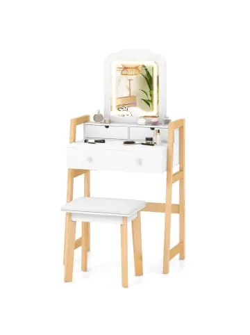 Beschreibung Suchen Sie noch ein Frisiertisch-Set als Geschenk für Ihre Freundin oder Ihr Kind? Unseres wird Sie mit seinem charmanten Aussehen und seiner Praktikabilität nicht enttäuschen. Bestehend aus MDF-Platten und Beinen aus Kiefernholz ist dieses Set stabil und langlebig. Das Verbindungsteil zwischen jeweils zwei Beinen trägt zur Stabilität bei. Ausgestattet mit einer großen und zwei kleinen Schubladen, sodass Sie genügend Platz haben, um Ihre Kosmetika und andere Gegenstände darin zu verstauen. Alltägliche Dinge können auch auf der Tischplatte platziert werden. Auf dem dazu passenden, gepolsterten Hocker können Sie beim Schminken bequem sitzen. Mit seiner glatten und weißen Oberfläche passt das elegante Set perfekt in Ihr Zuhause!Eigenschaften 3 Schubladen in verschiedenen Größen, Platz für Ihre Kosmetika und andere Gegenstände Runder Knauf und halbkreisförmige Aussparungen zum einfachen Öffnen und Schließen 2-stöckige, geräumige Tischplatte zum Platzieren Ihrer täglichen Gegenstände Großer und klarer Spiegel Spiegel in 3 Stufen höhenverstellbar Massivholzstützen für Kommode und Hocker verleihen Stabilität und Robustheit Ein Verbindungsteil zwischen je zwei Beinen sorgt für Standfestigkeit Weich gepolsterter Hocker bietet Ihnen ein komfortables Sitzerlebnis Der multifunktionale Hocker kann an verschiedenen Orten verwendet werden Modernes und prägnantes Erscheinungsbild, passt perfekt zu Ihrem Dekorationsstil Einfacher Zusammenbau, erforderliches Zubehör im Lieferumfang enthalten Materials: MDF and Holz (Tisch- und Stuhlbeine) Maße Frisiertisch: 64cm x 41cm x (130, 5cm-137cm) (L x B x H) Maße Hocker: 36cm x 28cm x 43cm (L x B x H) Nettogewicht: 18, 43 kg Gesamtgewicht: 23, 1 kg Tragfähigkeit Frisiertisch: 130 kg Tragfähigkeit Hocker: 110 kgLieferumfang: 1 × Frisiertisch 1 × Hocker 1 × Anleitung