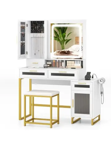 Beschreibung: Verbessern Sie Ihren Alltag mit diesem Schminktisch-Set. Dieser Schminktisch verfügt über eine integrierte Ladestation mit 2 USB-Anschlüssen und 2 AC-Steckdosen zum bequemen Aufladen von Geräten. Der LED-beleuchtete HD-Spiegel bietet einstellbare Helligkeiten und 3 Farboptionen, um Ihren Bedürfnissen gerecht zu werden. Mit reichlich Stauraum, darunter ein Schmuckschrank, Schubladen, ein offenes Regal und mehr, können Sie Ordnung halten. Dieses stilvolle und praktische Kosmetiktisch-Set ist ein perfektes Geschenk für Ihre Lieben zu besonderen Anlässen und kombiniert Funktionalität und Eleganz auf wunderbare Weise.Eigenschaften: HD-Silberspiegel mit 3-farbig einstellbaren LED-Leuchten Bequemes Aufladen von Geräten mit integrierten Steckdosen und USB-Anschlüssen Große Lagerkapazität mit Schränken und Schubladen Mehrere Trennwände im Schmuckschrank für eine gute Organisation Kann mit den mitgelieferten Kippschutzvorrichtungen an der Wand befestigt werden Mit Schubladenführungen aus Metall und Scharnieren mit sanftem Schließmechanismus Inklusive passendem Hocker mit gepolstertem Sitzkissen Perfektes Geschenk für Sie selbst oder Ihre Lieben Montage erforderlich Material: Holzwerkstoff, MDF, Glas Gesamtmaße: 112 x 39,5 x 145 cm (L x B x H) Tischmaße: 90 x 39,5 x 75 cm (L x B x H) Hockermaße: 40 x 30 x 45 cm (L x B x H) Spiegelmaße: 50 x 52,5 cm Tragfähigkeit der Tischplatte: 50 kg Tragfähigkeit des Hockers: 150 kg AC-Steckdose: 220-240 V/12 A USB-Anschluss: 5 V/2,1 A Länge des Netzkabels: 1,5 m Nettogewicht: 39 kgLieferungsumfang: 1 x Schminktisch mit Spiegel 1 x Hocker 1 x Handbuch