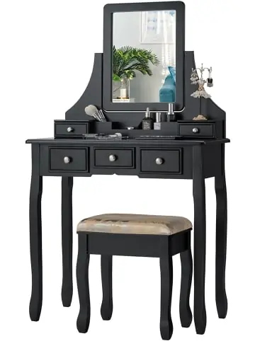 Beschreibung: Suchen Sie noch nach einem Frisiertisch für sich oder andere? Unser Set wird Sie mit seinem hübschen Aussehen und seinen praktischen Funktionen nicht enttäuschen. Mit 5 Schubladen bietet es viel Platz für Ihre Kosmetika und Schmuckstücke. Auf der Tischplatte können Sie weitere Produkte platzieren. Außerdem gibt es darauf noch eine abnehmbare Aufbewahrungsbox, in die sie z. B. Pinsel legen können. Deshalb ist unser Set ein ideales Geschenk für Töchter oder Freundinnen. Sie werden es lieben! Materialien: MDF und Holz (Tisch-& Hockerbeine) Frisiertischmaße: 80 x 40 x 139cm Hockermaße: 40 x 30 x 46cm Spiegelmaße: 41 x 31cm(L x W) Nettogewicht: 18,3kg Tragfähigkeit des Tischs: 130kg Tragfähigkeit des Hockers: 110kgLieferungsumfang: 1 × Frisiertisch 1 × Hocker 1 × Anleitung