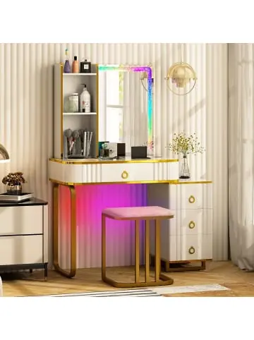 Beschreibung: Machen Sie sich bereit, mit diesem LED-beleuchteten Schminktisch-Set zu glänzen. 7 dynamische RGB-Modi und 7 statische RGB-Modi erzeugen verschiedene Lichteffekte und ermöglichen es Ihnen, die gewünschte Atmosphäre zu finden. Die Bedienung erfolgt einfach per Touch-Schalter und Fernbedienung. Dieser Schminktisch verfügt außerdem über ein großes Fassungsvermögen, einschließlich Ablageflächen und Schubladen. Die große Schublade unter der Tischplatte ist in mehrere, mit weichem Futter überzogene Fächer unterteilt, die für die Aufbewahrung von gedacht sind. Der gepolsterte Hocker wird mit dem Schminktisch geliefert, was zusammen für mehr Komfort bei Ihrer Morgenroutine sorgt.Eigenschaft: Verfügt über 7 dynamische RGB-Modi und 7 statische RGB-Modi Einfache Einstellung per Touch-Schalter oder Fernbedienung Ausgestattet mit einer kabellosen Ladestation, USB- und Typ-C-Anschlüssen auf der Tischplatte Verfügt über 3-stufige Lagerregale, einen Schrank mit 3 Schubladen und eine große Schublade mit Trennwänden Hergestellt aus strapazierfähigem MDF und stabilem Metallrahmen Wird mit einem gepolsterten Hocker für mehr Komfort geliefert Kann mit der mitgelieferten Kippsicherung an der Wand befestigt werden Erfüllt Ihre unterschiedlichen Bedürfnisse dank der problemlosen Installation des Schranks auf der linken oder rechten Seite Material: MDF + Kiefernholz + Metall Tischgröße: 80 cm x 40 cm x 137 cm (L x B x H) Maße des Hockers: 40 cm x 30 cm x 43 cm (L x B x H) Tischhöhe: 77 cm Spiegelmaße: 60 cm x 45 cm Tragfähigkeit der Tischplatte: 91 kg Tragfähigkeit des Hockers: 150 kg Länge des Netzkabels: 150 cm Eingangsleistung: 100-240V50/60Hz 700mA Ausgangsleistung: 12V=3000mA Nettogewicht: 34 kgLieferumfang: 1 x Schminktisch mit Beleuchtung 1 x Hocker 1 x Netzteil 1 x Bedienungsanleitung