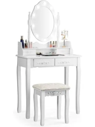 Beschreibung: Wenn Sie sich morgens in einem Meer Zubehör für Ihr Make-up wiederfinden, ist es Zeit, sich zu organisieren. Mit unserem Frisiertisch-Set haben Sie einen bestimmten Raum in Ihrem Zimmer, den Sie täglich dafür benutzen können. Machen Sie sich frisch und beginnen Sie den Tag mit dem hochauflösenden Spiegel. Unser Set besteht aus hochwertigen Beinen aus Kiefernholz mit rutschfesten Untersetzern, die ein Höchstmaß an Sicherheit gewährleisten. Mit seinem abnehmbaren Teil können Sie ihn sofort in einen Schreibtisch verwandeln. Die 10 um den Spiegel laufenden Lichter sind ein dekorativer Hit in Ihrem Zimmer und sorgen stets für ausreichende Beleuchtung beim Schminken!Eigenschaften: Helligkeitsstufe entsprechend derUmgebung änderbar Hergestellt aus hochwertigem MDF und massiven Kiefernholzbeinen zur Gewährleistung der Stabilität 4 Schubladen erleichtern die Aufbewahrung Ihrer Kosmetika und Ihres Schmucks Gepolsterter Hocker bietet ein komfortables Sitzerlebnis Rutschfeste Untersetzer zum Schutz vor einem Umfallen des Möbels Geeignet für Schlafzimmer, Badezimmer, Flur usw. Leicht zu montieren mit ausführlicher Anleitung Material: MDF + Kiefernholz Maße des Tisches:75 x 40 x 146cm (L x B x H) Maße des Hockers:36 x 27 x 43cm (L x B x H) Maße der großen Schublade: 27 x 9cm (L x B) Maße der kleinen Schublade: 20 x 9cm (L x B) Länge des Spiegels: 55cm Höhe des Tisches: 61cm Nettogewicht:17kg Tragfähigkeit des Hockers: 100kg Tragfähigkeit des Tisches: 25kgLieferumfang: 1 x Frisiertisch 1 x Hocker 1 x Anleitung