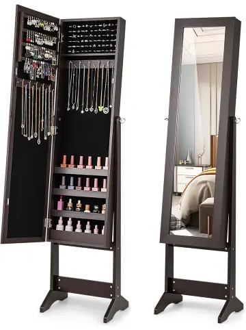 Beschreibung: Haben Sie schon einmal daran gedacht, eines Tages einen Spiegel mit einem Schmuckschrank zu kombinieren? Unser 2-in-1-Schmuckschrank ist der perfekte Begleiter für jede Frau mit einer vielfältigen Schmucksammlung. Der Schmuckschrank ist mit 64 Ohrringschlitzen und 44 Ohrringlöchern, 72 Ringschlitzen, 20 Halskettenhaken und 4 Ablagefächern ausgestattet. Der unterteilte Stauraum mit großem Fassungsvermögen ermöglicht es Ihnen, alle Ihre Schmuckstücke im Schrank unterzubringen. Er ist aus hochwertigem MDF gefertigt, um eine langfristige Nutzung zu gewährleisten. Darüber hinaus bietet Ihnen ein in 3Winkeln verstellbarer Spiegel in voller Länge ein Spiegelbild in Körpergröße. Mit seinem stilvollen und eleganten Design passt er perfekt zu jeder Wohnungseinrichtung.Eigenschaften: Aus hochwertigem MDF, Gewährleistung von Robustheit und Haltbarkeit Dicker Rahmen und dreieckige Füße zur Verbesserung der Stabilität Spiegel in voller Länge für eine Ansicht von Kopf bis Fuß 4 gefütterte Ohrringablagen mit 64 Ohrringschlitzen und 44 Ohrringlöchern 20 Haken in Abständen voneinander angeordnet, um zu verhindern, dass sich Halsketten miteinander verheddern 72 Ringschlitze, um verschiedene Ringe sortiert aufzubewahren 4 Regale zur Aufbewahrung von Kosmetika Weiche Fütterung im Inneren schützt Ihren Schmuck vor Kratzern Magnetischer Stopper, um Ihren Schmuck zur Sicherheit in einem geschlossenen Raum aufzubewahren Prägnantes und elegantes Erscheinungsbild, perfekt für Ihre Inneneinrichtung Material: MDF + Glasspiegel Gesamtmaße: 35 x 30 x 144 cm Spiegelgröße: 22,5 x 101,5 cm Gesamtgewicht: 10,5 kgLieferungsumfang: 1 x Schmuckschrank 1 x Anleitung