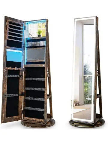 Beschreibung: Eine schöne und funktionale Ergänzung für jedes Schlafzimmer oder jeden Ankleidebereich! Mit seinem großen Fassungsvermögen bietet dieser Schmuckschrank ausreichend Platz zum Aufbewahren und Organisieren Ihrer wertvollen Schmuckkollektion. Das Highlight ist der LED-Ganzkörperspiegel mit 3 Lichtfarben, der Ihnen ein klares und gut beleuchtetes Spiegelbild bietet, während Sie Ihre gesamten Outfits überprüfen. Zudem verfügt er über einen integrierten Make-up-Spiegel mit dreifarbiger LED-Beleuchtung, der sich perfekt für das makellose Auftragen von Make-up eignet. Das hochklappbare Make-up-Regal sorgt für zusätzlichen Komfort und ermöglicht Ihnen den einfachen Zugriff und die Aufbewahrung Ihrer Kosmetika.Eigenschaften: Dient als Ganzkörperspiegel, Schminktisch, Schmuck-Organizer und Aufbewahrungsregal Großer und gut organisierter Stauraum mit Regalen, Haken, Schlitzen usw. Gewährleistete Sicherheit durch ein integriertes Schloss und die mitgelieferten Schlüssel 3 Farbmodi des Ganzkörperspiegels: Kaltweiß, Naturweiß, Warmweiß Eingebauter beleuchteter Schminkspiegel mit blauem oder weißem + blauem oder gelbem Beleuchtungsmodus Praktisch für das tägliche Make-up mit einer ausklappbaren Make-up-Ablage Hergestellt aus langlebigen Materialien und gut verarbeiteten Details für jahrelangen Gebrauch Ausgestattet mit einem drehbaren Sockel, der für Reflexion aus allen Winkeln sorgt Einfaches Öffnen und Schließen der Tür mit Magnetverschluss und Griff Material: MDF, Glas, Acryl Produktmaße: 54,5 x 54,5 x 160 cm (L x B x H) Maße des Ganzkörperspiegels: 37 x 155 cm (L x B) Schrankstärke: 10 cm Länge des Netzteils: 150 cm Nettogewicht: 24 kgLieferungsumfang: 1 x Schmuckschrank 2 x Schlüssel 1 x Anleitung