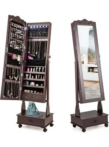Beschreibung: Halten Sie Ihren Schmuck ordentlich und anständig mit unserem bodenstehenden Schmuckschrank! Dieser aus hochwertigem MDF mit Lackierung gefertigte Schmuckschrank mit Ganzkörperspiegel verspricht eine lange Nutzungsdauer. Darüber hinaus bietet der geräumige Stauraum ein warmes Zuhause für Ihren Schmuck und Ihre Kosmetikaccessoires. Mit einem Vollbildspiegel können Sie neue Kleidung anprobieren und sich selbst besser betrachten. Zudem machen die LED-Leuchten den Schmuck attraktiver. Die abschließbare Tür verhindert, dass Ihr Kind oder Haustier Ihre geliebten Gegenstände zerstört. Wenn Sie ihn an einen anderen Ort bewegen müssen, sind die Universalräder mit 360°-Drehung eine große Hilfe. Und Sie können alle 4 Räder für zusätzliche Stabilität feststellen.Eigenschaften: 3 Neigungswinkel erfüllen Ihre unterschiedlichen Anforderungen Ausreichend Stauraum für alle wichtigen Schmuck- und Make-up-Utensilien Integrierte LED-Leuchten sorgen auch nachts für einen beleuchteten Schminkvorgang Die LED-Leuchten schalten sich automatisch ein/aus, sobald die Tür geöffnet wird Betrieb mit 3 x AAA 1,5V-Batterien (nicht im Lieferumfang enthalten) 4 Universalräder mit Feststellern für sanftes Bewegen Abschließbare Tür mit Schlüssel schützt Ihre Sachen Hochwertige Metallscharniere für den Langzeitgebrauch Praktische Schubladenknöpfe zum einfachen Öffnen Das exquisite Rosenmuster vermittelt ein Gefühl von Schönheit Materialien: MDF, Glas Gesamtmaße: 45 x 35 x 157 cm (L x B x H) Schrankgröße: 120 x 37 x 9,5 cm (L x B x H) Größe des Spiegels: 105,5 x 27 cm (L x B) Nettogewicht: 15,5 kgLieferungsumfang: 1 x Schmuckschrank 1 x Anleitung