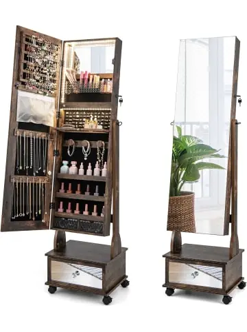 Beschreibung: Dieser 3-in-1 Schmuckschrank ist ein toller Helfer bei der Schmuckaufbewahrung und beim täglichen Anziehen. Der Stehschmuckschrank ist mit 2 Spiegeln ausgestattet: einem Ganzkörperspiegel und einem eingebauten Schminkspiegel. Der Schminkspiegel ist von dreifarbigen LED-Leuchten umgeben und die klappbare Ablage sorgt für mehr Komfort beim Schminken. Dieser Schmuck- und Kosmetik-Organizer ist mit Haken, Schlitzen, Regalen, Schubladen und mehr ausgestattet, um alle wichtigen Dinge in Ordnung zu halten. Der Ganzkörperspiegel lässt sich in 3 Winkeln verstellen und die feststellbaren Universalräder bieten große Flexibilität.Eingenschaften: Verfügt über einen Ganzkörperspiegel außen und einen Schminkspiegel innen Großes Fassungsvermögen mit vielen Haken, Schlitzen, Regalen, Schubladen und mehr Ausgestattet mit einem ausklappbaren Make-up-Regal zum Platzieren von Kosmetika oder Schmuck Eingebaute dreifarbige LED-Leuchten, die für Ihr routinemäßiges Make-up entwickelt wurden Kann je nach Körpergröße des Benutzers in 3 Winkeln eingestellt werden Verwendet Magnetverschluss und langlebige Metallscharniere Müheloses Bewegen durch 4 feststellbare Universalräder Einfache Montage mit Schritt-für-Schritt-Anleitung Material: MDF, Glas, Acryl Produktmaße: 42 cm x 35 cm x 159 cm (L x B x H) Größe des Spiegels in voller Länge: 120 cm x 37 cm (L x B) Schrankstärke: 10 cm Nettogewicht: 18,5 kgLieferungsumfang: 1 x Schmuckschrank 2 x Schlüssel 1 x Anleitung