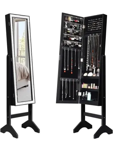 Beschreibung: Wenn Sie noch nach einem Schrank für all Ihren Schmuck suchen, dann schauen Sie sich unser Modell an! Durch das Holz und die Samtauskleidung im Inneren sind die wertvollen Stücke geschützt. Es sind viele Ringschlitze und Haken für Ketten vorhanden. Die Tür schließt sich durch die Stopper sanft und bleibt danach fest geschlossen. Mit dem klaren Ganzkörper-Spiegel können Sie sich von Kopf bis Fuß betrachten, was ideal zum Ankleiden ist. Um den Spiegel herum sind viele Glitzersteinchen angebracht, wodurch er absolut hinreißend aussieht. Zögern Sie nicht länger und schlagen Sie zu!Eigenschaften: Winkelverstellbares Design mit Ständer Glasspiegel für eine klare Sicht von Kopf bis Fuß, perfekt für die tägliche Makeup-Routine Glitzersteine für ein besonders hübsches Aussehen Unterteilter Stauraum für sortierte Aufbewahrung Weiche Samtauskleidung, um ein Zerkratzen des Schmucks zu verhindern Stopper für ein sanftes Schließen Robuste und langlebige Struktur durch hochwertige MDF-Platten Einfaches, aber hübsches Aussehen, passend zu jeder Einrichtung Material: MDF, Glas, Samt Gesamtmaße: 153 cm × 35,5 cm × 33 cm Maße des Innenraums: 110 cm × 31,5 cm × 9 cm Maße des Spiegels: 101 cm × 23 cm Produktgewicht: 9,4 kgLieferumfang: 1 × Schmuckschrank 2 × Ständer 1 × Zubehörbeutel 1 × Anleitung