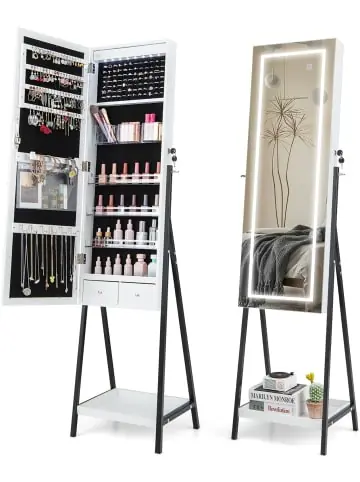 Beschreibung: Dieser Schmuckschrank mit großer Kapazität bietet Ihnen eine praktische und organisierte Lösung zum Aufbewahren und Ordnen all Ihrer wertvollen Schmuckstücke. Und die 3 Beleuchtungsoptionen können Ihre gesamte Schmucksammlung leicht beleuchten oder das perfekte Stück für jeden Anlass finden. Darüber hinaus dient dieser Schrank als 2-in-1-Aufbewahrungslösung, indem er einen Ganzkörperspiegel mit einem Schmuckschrank kombiniert. Jetzt können Sie Ihren Schmuck leicht aufbewahren und sicherstellen, dass er zu Ihrem Outfit passt, dank des praktischen Spiegels. In Bezug auf die Sicherheit hat unser Schrank ein abschließbares Design, das eine zusätzliche Schutzebene für Ihren wertvollen Schmuck bietet.Eigenschaften: Der interne Lichtschalter ist leicht ein- und auszuschalten Ausreichend Platz zur Aufbewahrung und Organisation all Ihrer wertvollen Schmuckstücke3 LED-Beleuchtungsoptionen sind perfekt zur Beleuchtung Ihrer Schmucksammlung Hergestellt aus hochwertigen Materialien für hohe Haltbarkeit Bietet zusätzliche Sicherheit für Ihre Schmucksammlung Das schützende Interieur hält Ihren Schmuck vor Kratzern und Beschädigungen sicher Fügen Sie mit dem modernen Design eine Note von Eleganz in Ihren Wohnraum hinzu Das abschließbare Design mit magnetischem Türverschluss erhöht die Sicherheit Ihrer Sammlung Material: MDF + Metall + Spiegel Produktabmessung: 41 x 35 x 160 cm (L x B x H) Dicke des Schranks: 10 cm Ganzkörperspiegelabmessung: 108 x 37 cm Länge des Netzkabels: 1,3 m Batterieanforderung: 3 AA-Batterien (nicht enthalten) Nettogewicht: 13,5 kgLieferungsumfang: 1 x Schmuckschrank 1 x Netzadapter 2 x Schlüssel 1 x Anleitung