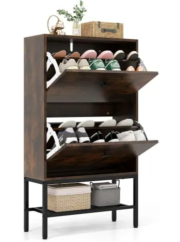 Beschreibung: Mit seinem flexiblen und platzsparenden Design ist dieser freistehende Schuhschrank die perfekte Lösung für die Organisation Ihres Schuhwerks. Sein vielseitiges Erscheinungsbild macht ihn zu einer stilvollen Ergänzung für jeden Raum.Eigenschaften: Ausgestattet mit 2 Klappschubladen bietet eine einzelne Ebene Platz für 2–3 Paar Schuhe und eine zusätzliche untere Ablage bietet ebenfalls Platz für 2–3 Paar Schuhe, insgesamt also für 10–15 Paar Schuhe. Ausgestattet mit herausnehmbaren und verstellbaren Trennwänden, wobei die mittlere Trennwand in 2 Stufen verstellbar ist (Verstellbereich 7°), wodurch eine Anpassung an unterschiedliche Schuhtypen möglich ist. Ausgestattet mit einer Kippschutzvorrichtung für zusätzliche Sicherheit und verstellbaren Fußpolstern für Stabilität. Die obere Platte kann 25 kg tragen, der untere Metallrahmen 15 kg und jede Innenschicht 10 kg. Maximieren Sie den Stauraum in kleinen Wohnräumen mit einem kompakten und effizienten Design. Praktische Griffe ermöglichen das Herausziehen und Einschieben der Schubladen Platzsparendes Design und dennoch großes Fassungsvermögen für praktische Nutzung Materialien: Holzwerkstoff, Metall, PP Produktabmessungen: 60 x 24 x 106 cm (L x B x H) Größe jeder Tür: 56 x 35 cm (L x B) Größe des unteren Regals: 50 x 23 cm (L x B) Höhe des unteren Regals: 11 cm Abstand zwischen dem unteren Regal und dem oberen Schrank: 15,5 cm Tiefe des inneren Schuhaufbewahrungsbereichs: 22/30 cm Höhe des inneren Schuhaufbewahrungsbereichs: 8,5/10,5 cm//9,5/9,5 cm Tragfähigkeit des oberen Schranks: 25 kg Tragfähigkeit jedes mittleren Regals: 10 kg Tragfähigkeit des unteren Regals: 15 kg Nettogewicht: 18,5 kgLieferungsumfang: 1 x Schuhschrank 1 x Anleitung