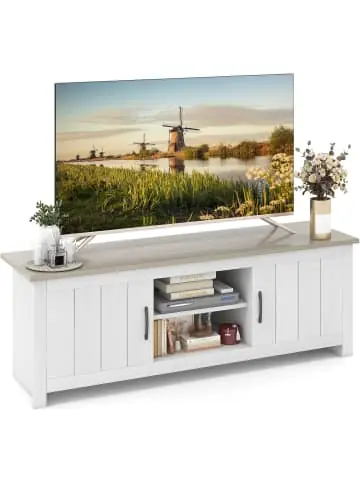 Beschreibung: Dieser gut gestaltete TV-Schrank wird Ihren Wohnraum beleben! Die geräumige Schrankoberseite ist mit der Größe der meisten Fernsehbildschirme kompatibel. 2-stufige offene Regale und 2 große Schränke zeigen seine starke Leistung bei der Aufbewahrung verschiedener Gegenstände. Darüber hinaus dienen die vorgebohrten Kabelführungslöcher dazu, die Kabel ordentlich zu organisieren. Holen Sie sich diesen TV-Schrank nach Hause, der die perfekte Balance zwischen Funktionalität und stilvollem Design bietet.Eigenschaften: Große Schrankplatte bietet Platz für einen 55-Zoll-/60-Zoll-/65-Zoll-Fernseher 2 große Schränke und offene Regale passen sich den Aufbewahrungsbedürfnissen an Verdickter Holzwerkstoff sorgt für Stabilität und Haltbarkeit Stabile Stützbeine für erhöhte Stabilität und zuverlässige Nutzung Rutschfeste Fußpolster schützen den Boden vor Kratzern Für ein sauberes und einheitliches Erscheinungsbild sind die Schraubenlöcher abgedeckt 2 Kabelführungslöcher sorgen dafür, dass unordentliche Kabel gut organisiert bleiben Praktischer Griff und Metallscharnier zum Öffnen und Schließen der Tür Der moderne Stil passt gut zur Inneneinrichtung Kann als TV-Ständer, Medienkonsolentisch oder Aufbewahrungsschrank verwendet werden Wird mit einer ausführlichen Anleitung zur einfachen Montage geliefert Material: Holzwerkstoff Gesamtmaße: 145 x 39,5 x 49,5 cm (L x B x H) Größe des Schranks: 44 x 29,5 cm (L x B) Größe des oberen offenen Regals: 45 x 30 x 19 cm (L x B x H) Größe des unteren offenen Regals: 45 x 30 x 15 cm (L x B x H) Abstand vom Schrank zum Boden: 8 cm Nettogewicht: 26 kg Gesamttragfähigkeit: 185 kg Tragfähigkeit der Tischplatte: 85 kgLieferungsumfang: 1 x TV-Schrank 1 x Montageanleitung