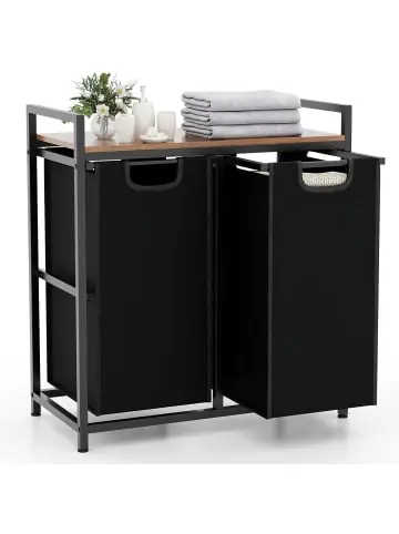 Beschreibung: Dieser Wäschesortierer mit Regal bietet eine großzügige Gesamtkapazität von 90 Litern, sodass Sie Ihre Wäsche sortieren und die Toilettenartikel griffbereit aufbewahren können. Robust und stabil mit einem Metallrahmen und einem Holzwerkstoffpaneel unterstützt dieser Wäschekorb 20 kg auf seinem Regal und verfügt über verstellbare Füße für zusätzliche Stabilität. Die 2 Innenfuttertaschen des Wäschekorbs sind mit Klettverschlüssen befestigt und können entfernt und getragen werden. Jeder Abschnitt besteht aus Oxford-Innenfutter, das maschinenwaschbar ist und sicherstellt, dass Ihr Sortierer hygienisch und frisch bleibt. Dieser vielseitige Wäscheorganisator fügt sich nahtlos in jeden Raum ein und sorgt für eine effiziente Wäscheorganisation.Eigenschaften: Robuster Metallrahmen gewährleistet eine langfristige Nutzung und Zuverlässigkeit Die 2 Innenfutter bestehen aus strapazierfähigem, wasserdichtem Oxford-Gewebe für Langlebigkeit Bietet eine große Kapazität von 80 Litern, ausreichend für den Wäschebedarf eines Haushalts 2 separate Abschnitte ermöglichen es Ihnen, Ihre hellen und dunklen Wäschen vorzusortieren Das obere Regal ist praktisch zum Platzieren von Waschmitteln und Weichspülern Ziehen Sie die 2 Taschen reibungslos heraus und verstecken Sie Ihre schmutzige Wäsche Enthält waschbare Innenfutter zur Aufrechterhaltung von Sauberkeit und Hygiene Perfekt für die Waschküche, das Schlafzimmer oder das Badezimmer Material: Metall, Holzwerkstoff, Oxford-Gewebe Gesamtabmessung: 73 cm x 33 cm x 72 cm (L x B x H) Gewichtskapazität jedes Wäschetaschenabschnitts: 5 kg Maximale Belastung des oberen Regals: 20 kg Bruttogewicht: 7,5 kgLieferumfang: 1 x Wäschekorb 1 x 2-Sektionen-Innenfuttertasche 1 x Anleitung