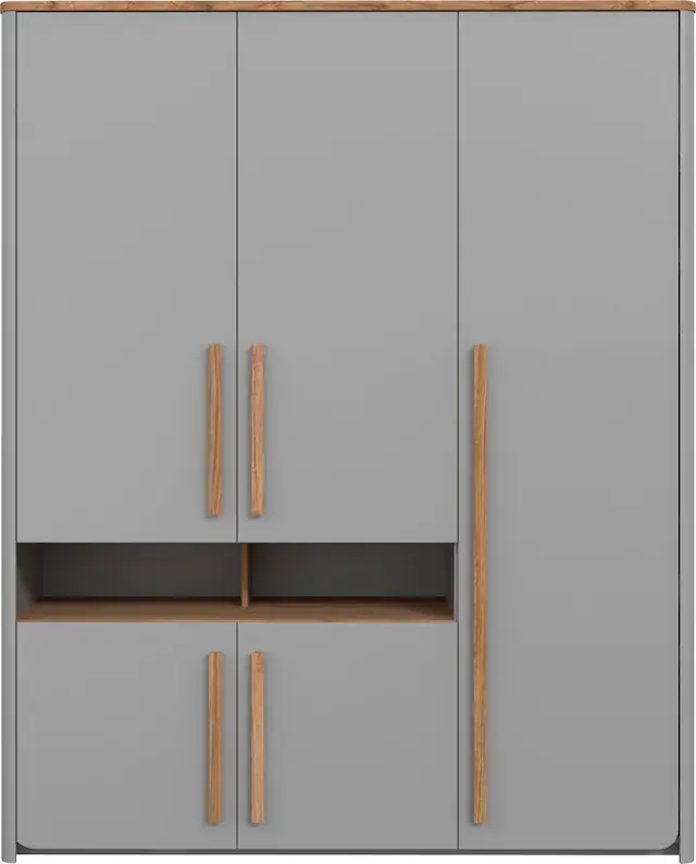 Moderner Kleiderschrank mit 5 Türen. 4 Einlegeböden variabel einsetzbar. 2 kleine offene Fächer. Viel Stauraum