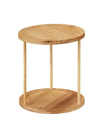Mit dem platzsparenden Küchenregal schaffst Du wertvollen Stauraum und bringst Ordnung ins Küchenchaos. Der Schrankeinsatz bietet Platz für Gewürzgläser, Ölflaschen, Teedosen und mehr. Der freistehende Regaleisatz ist flexibel auf der Arbeitsplatte oder im Küchenschrank platzierbar. Dank der Fertigung aus Bambus bringt der Küchen-Organizer ein Stück Natürlichkeit in Deine Küche. Die Ablagen des Gewürzständers halten dank des erhöhten Rands alle darauf platzierten Objekte sicher.Gewürzregal im Detail – Maße H x D: ca. 22,5 x 20 cm – Innendurchmesser Ablagen: ca. 17 cm – Abstand Ablagen: ca. 20 cm – Traglast je Ablage: max. 2 kg – Gewicht: ca. 0,4 kg – Material: Bambus – Farbe: NaturFreistehender Küchenorganizer – Zusätzlicher Stauraum und mehr Ordnung für die Küche – Einfacher Zugriff auf alle Utensilien auf 2 Etagen – Für Gewürze, Essig- und Ölflaschen, Teedosen uvm. – Auf der Arbeitsplatte oder im Küchenschrank platzieren – Fertigung aus dekorativem Bambus für natürlichen Charme – Auch fürs Badezimmer oder den Schreibtisch geeignetLieferumfang – 1x Gewürzständer in Einzelteilen – Dekoartikel sind nicht im Lieferumfang enthalten
