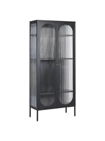 Moderner Metallschrank mit Glastüren. Setzen Sie Ihre Lieblingsdekoration in Szene und präsentieren Sie diese auf dieser besonderen Hochschrak. Die geriffelten Glastüren und die Seitenwände sorgen für einen wunderbaren optischen Effekt, der Ihren Wohnbereich verschönert. Das Stahlgestell garantiert die Stabilität des Möbels. Ein klassisches Schwarz mit einer matten Oberfläche in Verbindung mit goldenen Griffen verleiht dem Design einen glamourösen Touch.Details: Typ: Vitrine Farbe: Schwarz Material: Stahl Zusätzliches Material: Glas Gestellmaterial: Metall Türöffnungsarten: Standard Schubladen: Nein Finish: Pulverbeschichtet Abschliessbar: Nein Türanzahl: 4 Regalböden: JaDimensions: Tiefe: 35 cm Breite: 80 cm Höhe: 181 cm Gewicht: 43 kg Max. Belastung der Oberplatte: 20 kgSie kaufen: 1 x VitrinenschrankProduktvorteile: Verstellbare Sockelfüße sorgen für Standsicherheit, Höhenverstellbare Einlegeböden, Modernes Design, Passt ausgezeichnet zu vielen Einrichtungsstilen, Besonders pflegeleicht, Schutzkappen zum Schutz des BodensMontage: Nicht montiert. 20 – 40 Min.Zusatzinformationen: Bitte beachten: Aus Sicherheitsgründen muss das Produkt an der Wand montiert werden.Pflegeanleitung:Stahl: 1.Bitte ausschließlich handelsübliche, milde Reinigungsmittel und weiche Tücher verwenden, wobei feuchte Stellen sofort trocken gerieben werden sollten 2.Vermeiden Sie scheuernde Reiniger, da diese die Oberfläche beschädigen können 3.Bei Chrom und Kupfer regelmäßig mit speziellen Pflegemitteln polieren.Glas: 1.Bitte ausschließlich milde Reinigungsmittel bzw. Glasreiniger und weiche Tücher verwenden. Feuchte Stellen mit einem weichen Tuch trocken reiben 2.Keine scheuernden Reinigungsmittel nutzen, da diese die Oberfläche beschädigen können.