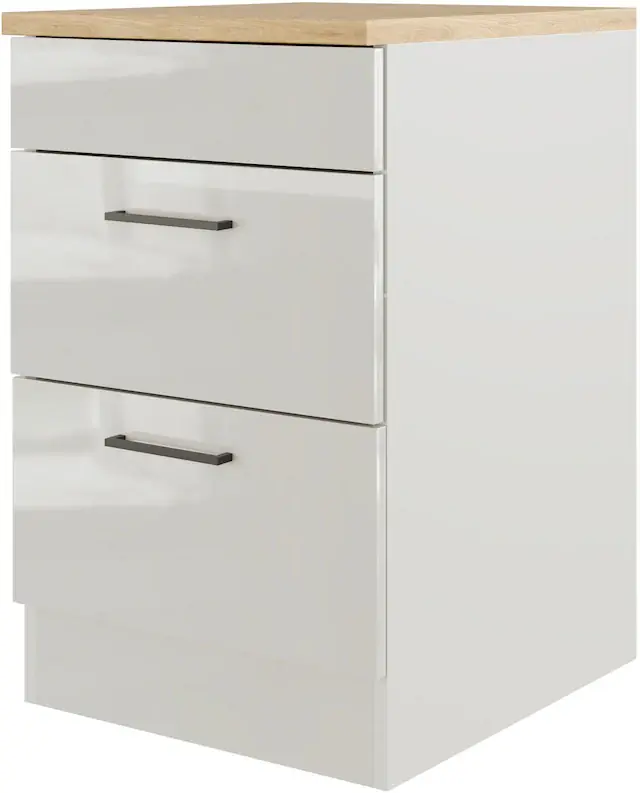 Kochstellenunterschrank mit pflegeleichter Oberfläche, Made in Germany. Einfache Selbstmontage. Metallbügelgriffe in edlem Schwarz. Günstiger Küchenschrank in guter Qualität. Vielseitig einsetzbar, einfache Montage