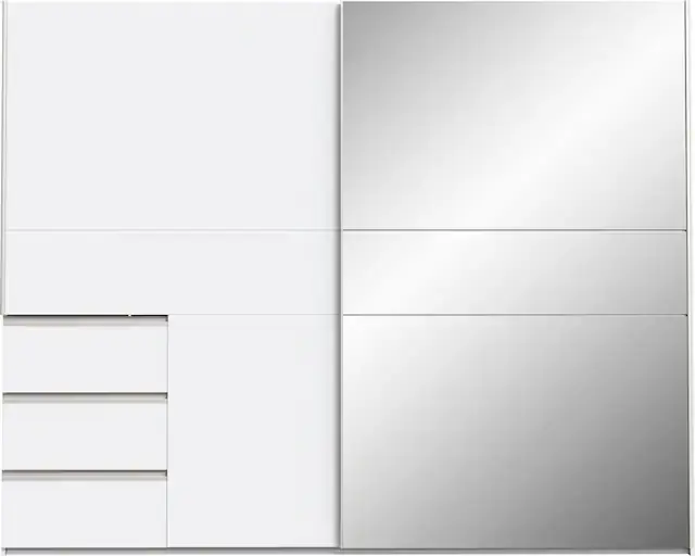 Schwebtürenschrank mit Spiegel. Schubkästen. Griffleiste Metall alufarbig. Kleiderstangen inklusive. Zubehör optional bestellbar