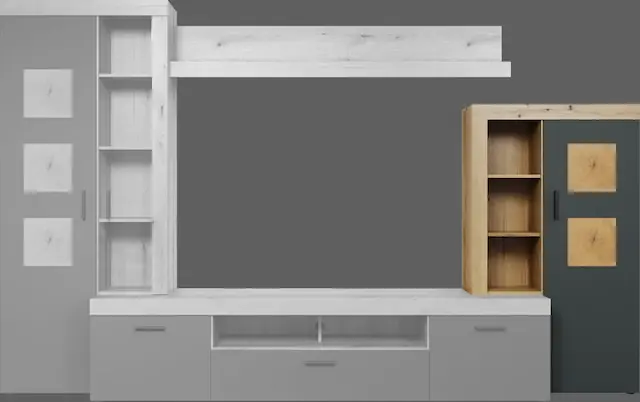 Die Hirnholzapplikationen der Serie verleihen in Kombination mit der Farbkombination aus Anthrazit und Eiche einen erstklassigen, lokalen Charme für dein Wohnzimmer. Die Tyler Serie ermöglicht eine schrittweise Anschaffung einzelner Elemente des Sets, um nach und nach die komplette Anbauwand nach individuellen Präferenzen zusammenzustellen. Dank der großzügigen Bauweise des Möbelstücks ist es mühelos möglich, alle wichtigen Geräte und Gegenstände rund um den Fernseher zu verstauen. Die Lieferung des Möbelstücks erfolgt in zwei Paketen, die gegebenenfalls separat geliefert werden können. Enthalten sind alle Teile für einen einfachen Zusammenbau. FSC®-zertifiziert