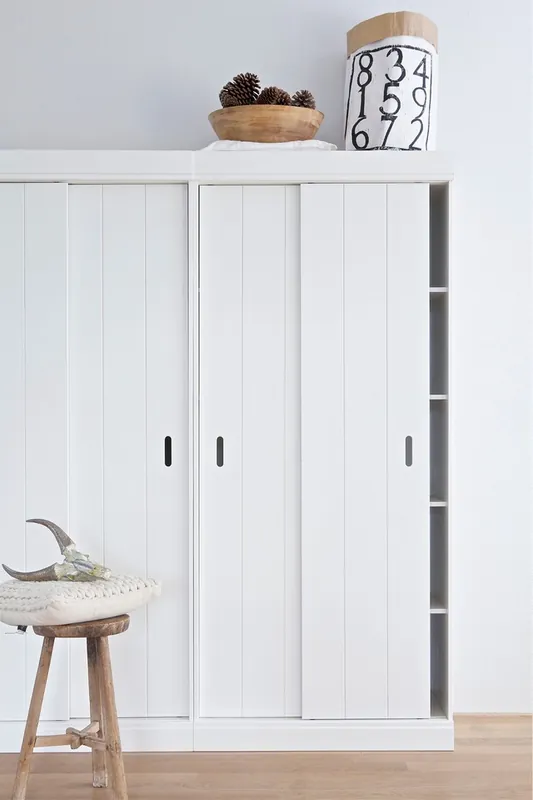 Basislagerschrank. Frisches weißes massives FSC®-zertifiziertes Kiefernholz. Dank der Schiebetüren auch für kleinere Räume geeignet. H 195 cm x B 84 cm x T 44 cm