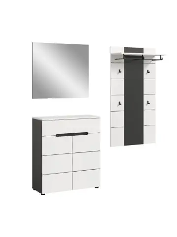 Canu Garderobenmöbel Set weiß, grau. Haken Stück: 4.Anzahl Paar Schuhe: 12.Tür Softclose.Schublade Vollauszug. Optimieren Sie Ihren Eingangsbereich mit der Garderobenkombination (B/H/T: 175x190x37 cm) in eleganter weißer Nachbildung! Diese Kombination bestehend aus einem Paneel, einer Schuhkommode und einem Spiegel bietet nicht nur praktischen Stauraum, sondern setzt auch ästhetische Akzente in Ihrem Flur. Die moderne Gestaltung sorgt für eine helle und freundliche Atmosphäre, während Sie gleichzeitig Ordnung halten. Perfekt für alle, die Stil und Funktionalität in ihrem Zuhause schätzen!