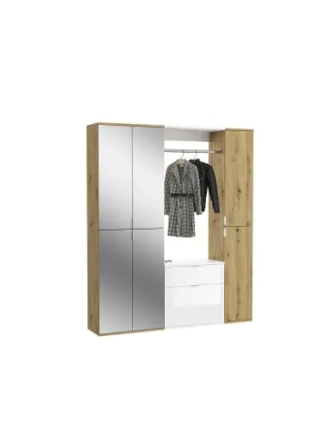 ProjektX Eingangsmöbel-Set Eichendekor, Spiegel. Tür kann rechts/links gedreht werden. Lose Einlegeböden: 11. Dieser elegante Kleiderschrank vereint Funktionalität und Stil mit Spiegeltüren, Schubladen und einer praktischen Kleiderstange. Perfekt für den Eingangsbereich oder das Schlafzimmer, wo Sie sowohl Stauraum als auch Platz zum Aufhängen von Kleidung benötigen. Die geräumigen Schubladen bieten guten Stauraum für Accessoires, Schuhe und Kleinigkeiten. Das elegante Design mit Spiegeltüren trägt zu einem hellen und offenen Raum bei, während die Holzstrukturen an den Seiten ein warmes und natürliches Gefühl im Zuhause erzeugen.