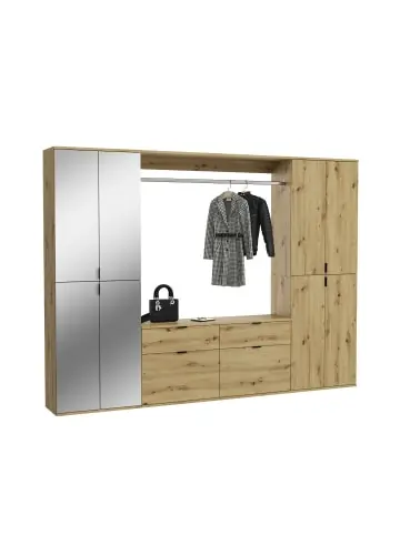 ProjektX Garderobenmöbel Set Eiche Dekor. Anzahl Paar Schuhe: 72.Schublade Vollauszug. Verleihen Sie Ihrem Flur, Ihrer Diele, Ihrem Hauswirtschaftsraum, Ihrem Büro und Ihrem Schlafzimmer mit unserer Garderobenkombination in Artisan Eiche Nachbildung eine stilvolle Note. Das natürliche Holzdesign schafft eine warme und einladende Atmosphäre, während die Option mit Spiegelglas zusätzliche Eleganz und Helligkeit in den Raum bringt. Mit ausreichend Stauraum ist diese Garderobenkombination die perfekte Wahl für eine organisierte und ästhetische Einrichtung.