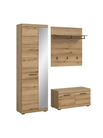 Das dreiteilige Scout Eingangsmöbel-Set ist eine praktische und stilvolle Lösung für den Eingangsbereich. Es besteht aus einem hohen Kleiderschrank mit Spiegeltür, einer geräumigen Bank mit Stauraum und einer Wandgarderobe mit Ablage und Kleiderstange.Das Design kombiniert das warme, natürliche Eichendekor mit eleganten schwarzen Griffen und Metallbeschlägen und verleiht so einen modernen und zeitlosen Look. Die Möbel sind funktional und eignen sich zur Aufbewahrung von Schuhen, Jacken, Taschen und alltäglichen Kleinigkeiten – während der Spiegel eine praktische und offene Atmosphäre schafft.Die FSC®-Mix-Zertifizierung (FSC-C170479) legt den Schwerpunkt auf verantwortungsvolle Materialien aus kontrollierten Quellen.