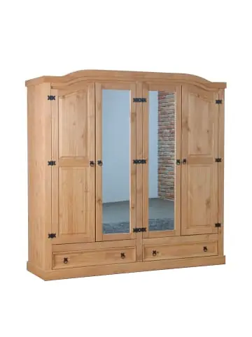 New Mexico 4-türiger Kleiderschrank mit 2 Spiegeltüren, 2 Fülltüren und 2 Schubladen. Breite 194 cm, Höhe 193 cm. Lauge/Wachs ist ein Kleiderschrank in der Farbe Natur, der sowohl Stil als auch Funktionalität in Ihr Zuhause bringt. Schöner, rustikaler 4-türiger Kleiderschrank mit 2 Spiegeltüren, 2 Fülltüren und 2 Schubladen im Antik-Stil. Der Schrank ist aus massivem Kiefernholz gefertigt, das mit Lauge/Wachs behandelt wird, sodass die Holzstruktur sichtbar ist. Hinter den beiden Türen finden Sie 1 Kleiderstange und 1 Hutablage. Hinter den anderen 2 Türen finden Sie 1 festes und 2 lose Einlegeböden. Dieses Produkt wurde mit viel Liebe zum Detail hergestellt, was sowohl Ästhetik als auch hohe Haltbarkeit gewährleistet. Bei der Gestaltung wurde sowohl auf Funktionalität als auch auf Stil geachtet, was es zur perfekten Wahl für jeden Raum in Ihrem Zuhause macht. Die verwendeten Materialien sind von hoher Qualität, was dem Produkt eine lange Lebensdauer verleiht und dafür sorgt, dass es dem täglichen Gebrauch standhält. Ob zur Aufbewahrung oder als dekorative Ergänzung, dieses Produkt wertet Ihre Einrichtung auf und bringt zusätzlichen Komfort und Eleganz in Ihr Zuhause.