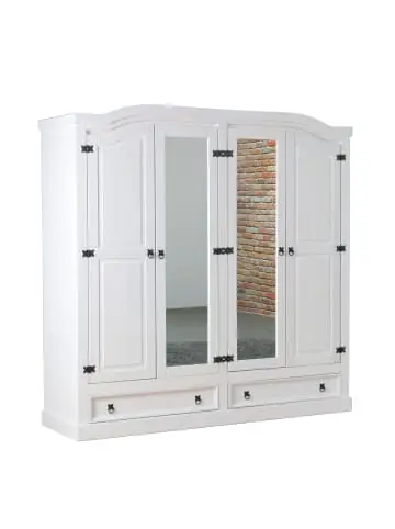 Der 4-türige Kleiderschrank „New Mexico“ mit 2 Spiegeltüren, 2 Fülltüren und 2 Schubladen in Weiß, Wachs ist ein Kleiderschrank in der Farbe Weiß, der sowohl Stil als auch Funktionalität in Ihr Zuhause bringt. Schöner, weißer und rustikaler 4-türiger Kleiderschrank mit 2 Spiegeltüren, 2 Fülltüren und 2 Schubladen im Antik-Stil. Der Schrank ist aus massivem, gewachstem Kiefernholz gefertigt, wobei die Holzstruktur sichtbar ist. Hinter den beiden Türen finden Sie 1 Kleiderstange und 1 Hutablage. Hinter den anderen 2 Türen finden Sie 1 festes und 2 lose Einlegeböden. Dieses Produkt wurde mit viel Liebe zum Detail hergestellt, was sowohl Ästhetik als auch hohe Haltbarkeit gewährleistet. Bei der Gestaltung wurde sowohl auf Funktionalität als auch auf Stil geachtet, was es zur perfekten Wahl für jeden Raum in Ihrem Zuhause macht. Die verwendeten Materialien sind von hoher Qualität, was dem Produkt eine lange Lebensdauer verleiht und dafür sorgt, dass es dem täglichen Gebrauch standhält. Ob zur Aufbewahrung oder als dekorative Ergänzung, dieses Produkt wertet Ihre Einrichtung auf und bringt zusätzlichen Komfort und Eleganz in Ihr Zuhause.