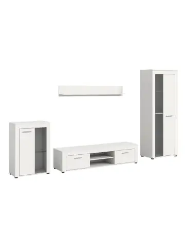 Jam Regal System weiß. Tür umkehrbar. Bringen Sie Ordnung und Stil in Ihr Zuhause mit dieser modernen Wohnkombination. Mit großzügigen Maßen von B/H/T: 310x159x35 cm bietet dieses Möbelstück viel Stauraum und fügt sich dank der eleganten weißen Front harmonisch in jeden Wohnbereich ein. Die robuste Melaminbeschichtung sorgt für eine langlebige und pflegeleichte Oberfläche. Die Wohnkombination überzeugt mit ihrer durchdachten Ausstattung: Zwei Türen, zwei Glastüren und drei variable Einlegeböden bieten flexible Möglichkeiten, Ihre Wohnaccessoires, Bücher oder Dekoration stilvoll zu präsentieren und sicher zu verstauen. Das Möbelstück besteht aus FSC®-zertifiziertem Holzwerkstoff und leistet somit einen wichtigen Beitrag zum Schutz unserer Wälder und zu nachhaltigem Wohnen. Setzen Sie auf eine Kombination aus Funktionalität, Design und Umweltbewusstsein die perfekte Wahl für jedes moderne Zuhause!