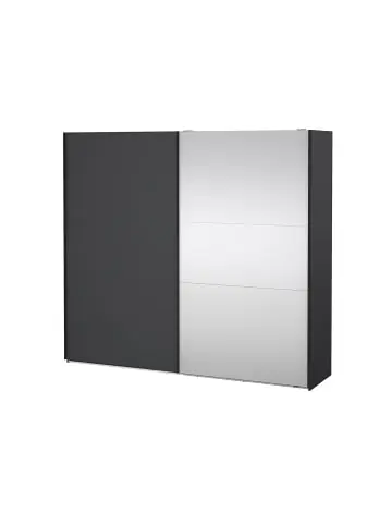 Der elegante Como Schiebetürenschrank in Mattgrau mit Spiegeltür ist eine moderne und funktionale Aufbewahrungslösung für Schlafzimmer oder Eingangsbereich. Der Schrank ist 245 cm breit und 220 cm hoch und bietet viel Platz für Kleidung, Schuhe und Aufbewahrungsboxen. Eine Tür ist mit einem großen Spiegel ausgestattet, der nicht nur praktisch ist, sondern den Raum auch größer und heller erscheinen lässt. Die mattgraue Oberfläche sorgt für eine ruhige und stilvolle Optik, die sich problemlos mit vielen verschiedenen Wohnstilen kombinieren lässt. Die platzsparenden Schiebetüren lassen sich leichtgängig bewegen und bieten optimalen Zugriff auf den gesamten Schrankinhalt – auch in kleineren Räumen.