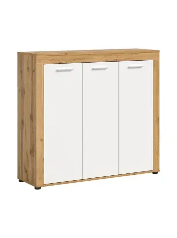 Der Jam Schuhschrank mit 3 Türen vereint moderne Funktionalität mit einer warmen und einladenden Optik. Die weißen Türen bilden einen schönen Kontrast zum dekorativen Rahmen in Eichenoptik und verleihen dem Interieur eine natürliche Note. Das schlichte und stilvolle Design passt sowohl in klassische als auch moderne Eingangsbereiche.Der Schrank bietet viel Platz für viele Paar Schuhe und sorgt für Ordnung im Schuhschrank, sodass der Eingangsbereich aufgeräumt und organisiert wirkt. Die drei Türen lassen sich dank schmaler Metallgriffe leicht öffnen. Der Schrank steht auf kleinen schwarzen Füßen, die die Reinigung unter den Möbeln erleichtern. Dank seiner breiten Form eignet er sich besonders für größere Haushalte oder Räume, in denen zusätzlicher Stauraum benötigt wird.Das Produkt besteht aus Holzwerkstoffen und ist FSC®-Mix-zertifiziert (FSC-C170479). Das bedeutet, dass das Holz aus dokumentierten und kontrollierten Quellen stammt.