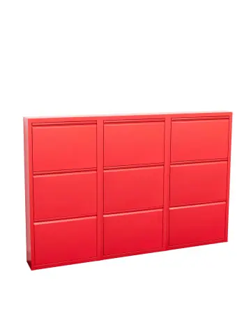 Schuhschrank Pisa mit 9 Türen in Metallrot. Komplett montiert wird ein Schuhschrank in der Farbe Rot geliefert, der sowohl Stil als auch Funktionalität in Ihr Zuhause bringt. Komplett montiert geliefert. RAL 3020 rot. Schublade innen: B46/L29/T13 cm. Kann auf den Boden gestellt oder an die Wand gehängt werden. Einzeln verwendbar. Türen öffnen sich gleichzeitig. Dieses Produkt wurde mit viel Liebe zum Detail hergestellt, was sowohl Ästhetik als auch hohe Haltbarkeit gewährleistet. Bei der Gestaltung wurde sowohl auf Funktionalität als auch auf Stil geachtet, was es zur perfekten Wahl für jeden Raum in Ihrem Zuhause macht. Die verwendeten Materialien sind von hoher Qualität, was dem Produkt eine lange Lebensdauer verleiht und dafür sorgt, dass es dem täglichen Gebrauch standhält. Ob zur Aufbewahrung oder als dekorative Ergänzung, dieses Produkt wertet Ihre Einrichtung auf und bringt zusätzlichen Komfort und Eleganz in Ihr Zuhause.