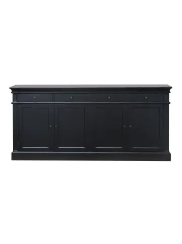 Das Amaretta-Sideboard mit 4 Türen und 4 Schubladen, Breite 186 cm, Höhe 86 cm, Antikschwarz, ist ein Sideboard in der Farbe Schwarz, das sowohl Stil als auch Funktionalität in Ihr Zuhause bringt. Sideboard aus Massivholz in unserer beliebten Amaretta-Serie. Antik patiniert und schwarz lackiert mit antiken Metallgriffen und mit 4 Schubladen und 4 Türen und 2 Einlegeböden. Perfekt zur Aufbewahrung von feinem Geschirr. Solide Qualitätsmöbel mit Seele. Stilvolles Design mit antiker Patinierung. Ein hochwertiges Möbelstück, stilvoll, charmant und solide. Dieses Produkt wurde mit viel Liebe zum Detail hergestellt, was sowohl Ästhetik als auch hohe Haltbarkeit gewährleistet. Bei der Gestaltung wurde sowohl auf Funktionalität als auch auf Stil geachtet, was es zur perfekten Wahl für jeden Raum in Ihrem Zuhause macht. Die verwendeten Materialien sind von hoher Qualität, was dem Produkt eine lange Lebensdauer verleiht und dafür sorgt, dass es dem täglichen Gebrauch standhält. Ob zur Aufbewahrung oder als dekorative Ergänzung, dieses Produkt wertet Ihre Einrichtung auf und bringt zusätzlichen Komfort und Eleganz in Ihr Zuhause.