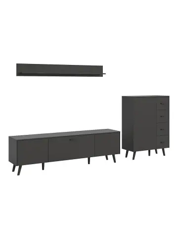 Das Linea Regalsystem in Mattgrau bietet eine elegante und moderne Aufbewahrungslösung für das Wohnzimmer. Es besteht aus einem geräumigen, niedrigen Sideboard mit zwei Türen und einer Flügeltür, einem hohen Sideboard mit vier Schubladen und einer Tür sowie einem langen Wandregal, das Ihre Einrichtung perfekt abrundet.Das strenge Design wird durch die charakteristischen diagonal gemusterten Fronten unterbrochen, die für einen exklusiven Look sorgen, ohne Kompromisse bei der Funktionalität einzugehen. Die mattgraue Oberfläche sorgt für eine ruhige und stilvolle Atmosphäre, und die hohen Beine in derselben Farbe sorgen für einen leichten Ausdruck und eine einfache Reinigung unter den Möbeln.Alle Elemente der Serie sind aus FSC®-Mix-zertifizierten Materialien (FSC-C170479) gefertigt, was bedeutet, dass das Holz aus verantwortungsvoller Forstwirtschaft stammt. Mit dem Linea Regalsystem erhalten Sie eine umfassende Auswahl an Möbeln für Aufbewahrung und Dekoration.