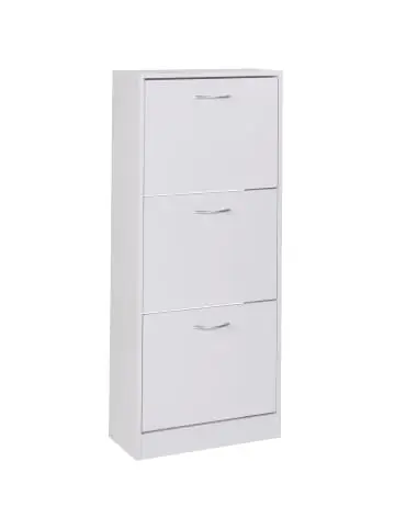 Artikelnummer: FB45029 EAN: 4250950264274Design• Schuhschrank mit 3 Fächern zum Aufklappen • Praktische und integrierte Griffe an jedem Fach • Modernes Design in weiß – Passend zu jeder StilrichtungAbmessungen• Breite: ca. 50 cm • Höhe: ca. 125 cm • Tiefe: ca. 24 cmInnenabmessungen• Breite: 46 cm • Tiefe: 38 cm • Weitere Abmessungen: Siehe DetailbildFarbe• WeißBesonderheiten• Kippfächer mit praktischem Scharnier und integriertem Stopp • Pro Regal passen ca. 6 Paar Schuhe mit Schuhgröße 38 – Dies kann je nach Form der Schuhe abweichen • Für freistehende Platzierung in Wandnähe vorgesehen – Rückseite des Regals offenMaterial• SpanplatteLieferumfang• 1 Schuhschrank • Lieferung ohne DekorationMontage• Lieferzustand: Praktisch zerlegt und verpackt • Montageanleitung inklusivePflegehinweise: Die Oberfläche mit einem lauwarm angefeuchteten Baumwolltuch reinigen; Keine Scheuermittel, scharfe Reinigungsmittel oder tropfnasse Tücher verwenden