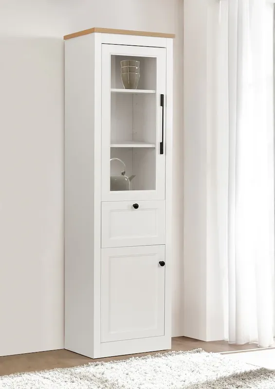 Deine Lieblings-Vitrine von OTTO Home. Zeitloses Design in weiß mit kontrastierender Holz-Zierleiste für einen modernen Landhausstil. Gefertigt aus hochwertigem MDF – robust, pflegeleicht und langlebig. Große Glastür mit markantem, schwarzem Metallgriff, mit rundem Metallknauf an Schubkasten und Tür. Gesamtmaße (B/T/H) ca. 49/39/180,5 cm