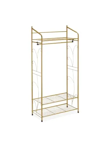 Dieser verzierte Kleiderständer bietet Dir jede Menge Stauraum im Flur oder Schlafzimmer und überzeugt mit seinem offenem Design. Hänge Deine Hemden, Blusen und andere Kleidungsstücke übersichtlich an der Garderobenstange auf. Auf den Schuhablagen finden bis zu 6 Paar Deiner Schuhe oder Taschen ihren Platz. Für Hüte und Ordnungsboxen bietet sich die obere Ablage ideal an. Dank des schlichten Looks aus Metall fügt sich das Kleidergestell in jeden Einrichtungsstil perfekt ein.Kleiderständer im Detail- Maße H x B x T: ca. 161 x 78 x 36 cm- Traglast: max. 20 kg- Gewicht: ca. 4,3 kg- Material: Eisen- In verschiedenen Farben Garderobenständer mit Schuhablage- Maße Ablagen B x T: ca. 71 x 35 cm- Abstand zwischen unteren Ablagen: ca. 20,5 cm – Maße Kleiderstange B x D: ca. 76 x 2 cm – Abstand zwischen Kleiderstange und Ablage: ca. 100 cm – Abstand zum Boden: ca. 7 cmFlurgarderobe mit Kleiderstange und Ablagen – Mit Kleiderstange zum Aufhängen von Jacken und Oberbekleidung – Inklusive 2 Ablagen für Schuhe, Taschen, Ordnungsboxen uvm. – Obere Ablage zum Aufbewahren von Hüten, Mützen oder Schals – Ideal für Eingangsbereich, Flur, Diele oder Schlafzimmer – Dezentes Design mit geschwungenen VerzierungenLieferumfang – 1x Kleiderständer in Einzelteilen – Mit Anleitung und Montagematerial – Dekoartikel sind nicht im Lieferumfang enthalten