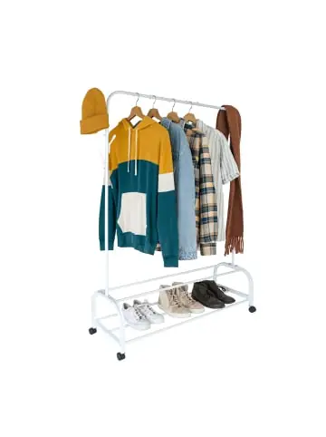 Sorge für Ordnung und Stil in Deinem Zuhause mit diesem eleganten, rollbaren Kleiderständer aus Eisen. Dank seiner robusten Konstruktion bietet er nicht nur eine stabile Aufhängemöglichkeit auf der Stange und 8 seitlichen Haken, sondern auch zusätzlichen Stauraum durch die 2 unteren Ablagen. Ob im Schlafzimmer, Flur oder Ankleidezimmer – dieser Kleiderständer ist die perfekte Lösung zur Kleideraufbewahrung, ohne dabei auf Stil zu verzichten.Kleiderständer im Detail – Größe H x B x T: ca. 160 x 110 x 40 cm – Abstand zw. den Ablagen: ca. 17,5 cm – Traglast Kleiderstange: ca. 14 kg – Traglast Ablage: je ca. 30 kg – Traglast Haken: je ca. 2 kg – Material: Eisen, Kunststoff – In verschiedenen FarbenGarderobenständer mit 2 Ablagen und Haken – Für mehr Ordnung im Flur, Büro, Schlafzimmer etc. – Flexibel verschiebbar dank 4 beweglicher Rollen – Stopper-Kugeln auf Kleiderstange verhindern Herunterrutschen – Praktische Ablageflächen für Schuhe und Aufbewahrungsboxen – 8 seitliche Haken zum Aufhängen von Taschen oder Hüten – Modernes, dezentes Design passt in jede EinrichtungLieferumfang – 1x Kleiderständer in Einzelteilen – Montagematerial und Anleitung – Dekoartikel sind nicht im Lieferumfang enthalten