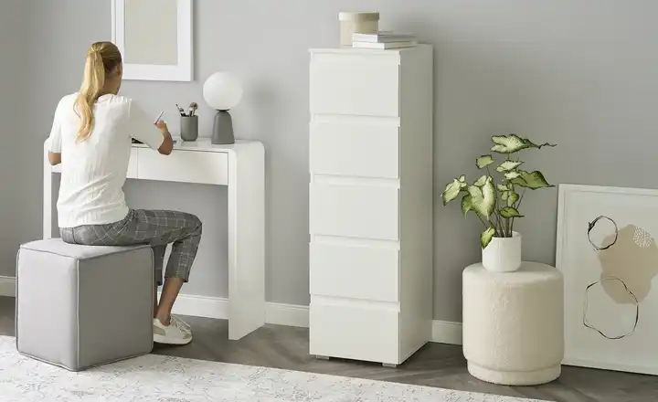 Die Hochkommode BEN ist mit fünf Schubladen ausgestattet, die übereinander angeordnet sind. Jede Schublade nimmt die gesamte Breite der Kommode ein. Korpus und Front haben eine folierte Oberfläche, die unempfindlich und leicht zu pflegen ist.
