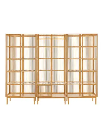 Garderobenständerset Dieses praktische Wohnraumset besteht aus einem stilvollen Kleiderständer und zwei flexibel einsetzbaren Standregalen. Es eignet sich ideal um Ordnung in Ihrem Eingangsbereich, Schlafzimmer oder Flur zu schaffen. Die drei Elemente können durch Schrauben schnell und einfach miteinander verbunden werden oder bei Bedarf unabhängig voneinander genutzt werden. Falls gewünscht kann das Set sogar noch erweitert werden, da die Artikel auch separat erhältlich sind. Der Garderobenständer verfügt über eine großzügige Kleiderstange, die ausreichend Platz für Mäntel, Jacken und Schals bietet. Die stabile Konstruktion gewährleistet, dass Ihre Kleidungsstücke sicher und knitterfrei aufgehängt werden können. Die obere Ablagefläche des Garderobenständers dient als Hutablage und bietet reichlich Platz für mehrere Kopfbedeckungen. Hier können Sie Ihre Hüte oder Mützen stilvoll präsentieren und griffbereit aufbewahren. Darüber hinaus verfügt die Garderobe über ein praktisches unteres Ablagefach. Hier können Sie Schuhe, Taschen oder andere Accessoires ordentlich verstauen, um Ihren Raum aufgeräumt zu halten. Das Ablagefach ist geräumig genug, um mehrere Gegenstände gleichzeitig aufzunehmen. Außerdem kann die Oberfläche des Staufachs als weitere Ablagemöglichkeit genutzt werden. Die zwei dazugehörigen Bambusregale verfügen jeweils über fünf geräumige Ablagefächer und stellen genügend Raum zur Verfügung, um Ihre Gegenstände ordentlich und übersichtlich zu verstauen. Ob T-Shirts, Hosen oder andere Kleidungsstücke, die Garderobenregale ermöglichen Ihnen eine ordentliche und platzsparende Aufbewahrung. Produkt-Highlights: – Kombination aus Kleiderständer und zwei Standregalen mit je 5 Ablagefächern – Möbelstücke lassen sich durch Schrauben miteinander verbinden – Unteres Ablagefach zum verstauen von Schuhen und anderen Accessoires – Kleiderstange zum knitterfreien Aufhängen von Jacken Und Mänteln – Obere Ablagefläche lässt sich ideal als Hutablage nutzen – Natürliches und umweltfreundliches Material – Schneller und einfacher Aufbau Belastbarkeit: – Garderobenstange: max. 10 kg – Ablagen über dem unteren Staufach: je max. 10 kg – Unteres Ablagefach: je max. 20 kg Maße: – Kombiniert (HxBxT): 185 x 240 x 45 cm – Garderobenständer (HxBxT): 185 x 80 x 45 cm – Standregal (HxBxT): je 185 x 80 x 45 cm – Ablagefach Innen (HxBxT): je 31 x 76 x 41 – 43 cm – Abstand von der Kleiderstange zur Ablage über dem Staufach: 118 cm – Länge der Garderobenstange: 75 cm – Fußhöhe: je 20 cm Material: Bambus Farbe: Natur Lieferumfang: – 1 x Garderobenständer – 2 x Standregal Markenware aus dem Hause: [en.casa]