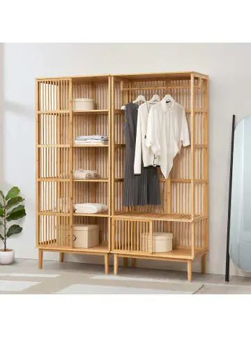 Garderobenständerset Dieses praktische Wohnraumset besteht aus einem stilvollen Kleiderständer und einem flexibel einsetzbaren Standregal. Es eignet sich ideal um Ordnung in Ihrem Eingangsbereich, Schlafzimmer oder Flur zu schaffen. Die beiden Elemente können durch Schrauben schnell und einfach miteinander verbunden werden oder bei Bedarf unabhängig voneinander genutzt werden. Das Regal kann sowohl links als auch rechts vom Garderobenständer montiert werden. Falls gewünscht kann das Set sogar noch erweitert werden, da die Artikel auch separat erhältlich sind. Der Garderobenständer verfügt über eine großzügige Kleiderstange, die ausreichend Platz für Mäntel, Jacken und Schals bietet. Die stabile Konstruktion gewährleistet, dass Ihre Kleidungsstücke sicher und knitterfrei aufgehängt werden können. Die obere Ablagefläche des Garderobenständers dient als Hutablage und bietet reichlich Platz für mehrere Kopfbedeckungen. Hier können Sie Ihre Hüte oder Mützen stilvoll präsentieren und griffbereit aufbewahren. Darüber hinaus verfügt die Garderobe über ein praktisches unteres Ablagefach. Hier können Sie Schuhe, Taschen oder andere Accessoires ordentlich verstauen, um Ihren Raum aufgeräumt zu halten. Das Ablagefach ist geräumig genug, um mehrere Gegenstände gleichzeitig aufzunehmen. Außerdem kann die Oberfläche des Staufachs als weitere Ablagemöglichkeit genutzt werden. Das dazugehörige Bambusregal verfügt über fünf geräumige Ablagefächer und stellt genügend Raum zur Verfügung, um Ihre Gegenstände ordentlich und übersichtlich zu verstauen. Ob T-Shirts, Hosen oder andere Kleidungsstücke, das Garderobenregal ermöglicht Ihnen eine ordentliche und platzsparende Aufbewahrung. Produkt-Highlights: – Kombination aus Kleiderständer und Standregal mit 5 Ablagefächern – Möbelstücke lassen sich durch Schrauben miteinander verbinden – Standregal kann sowohl links als auch rechts montiert werden – Unteres Ablagefach zum verstauen von Schuhen und anderen Accessoires – Kleiderstange zum knitterfreien Aufhängen von Jacken Und Mänteln – Obere Ablagefläche lässt sich ideal als Hutablage nutzen – Natürliches und umweltfreundliches Material – Schneller und einfacher Aufbau Belastbarkeit: – Garderobenstange: max. 10 kg – Ablagen über dem unteren Staufach: je max. 10 kg – Unteres Ablagefach: je max. 20 kg Maße: – Kombiniert (HxBxT): 185 x 160 x 45 cm – Garderobenständer (HxBxT): 185 x 80 x 45 cm – Standregal (HxBxT): 185 x 80 x 45 cm – Ablagefach Innen (HxBxT): je 31 x 76 x 41 – 43 cm – Abstand von der Kleiderstange zur Ablage über dem Staufach: 118 cm – Länge der Garderobenstange: 75 cm – Fußhöhe: je 20 cm Material: Bambus Farbe: Natur Lieferumfang: – 1 x Garderobenständer – 1 x Standregal Markenware aus dem Hause: [en.casa]