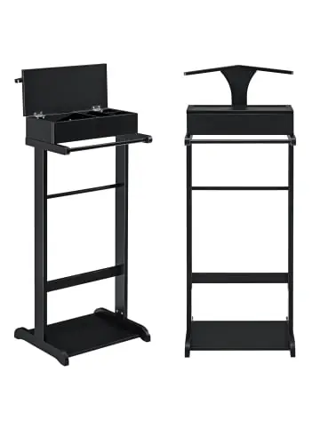 Stummer Diener Der stilvolle Kleiderständer verfügt neben einem Kleiderbügel und einem Hosenhalter auch über ein praktisches Aufbewahrungsfach für bspw. Uhren, Armbänder oder Manschettenknöpfe. Produktdetails: – Gestell für Anzüge, Mäntel, Jacken, usw. – Mit Kleiderbügel und Hosenhalter – Untere Ablage für Schuhe – Aufklappbares Staufach mit 4 Fächern – Pflegeleicht Maße (LxBxH): 43,5 x 34,5 x 110 cm Material: MDF + Kiefernholz Farbe: Schwarz Lieferumfang: 1 x Herrendiener Markenware aus dem Hause: [en.casa]®